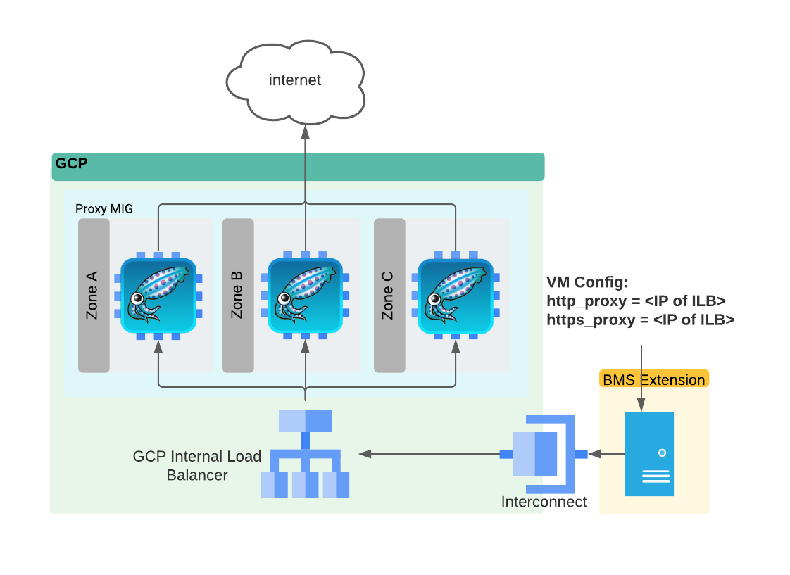 - Internal Load Balancer: An internal load balancer is created to balance web proxy requests between each host in the instance group. This internal load balancer utilizes health checks to the proxy port of each host to ensure traffic is only sent to active hosts.