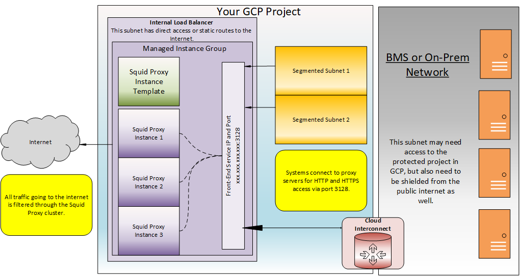 Some cloud environments must be segmented from the Internet for security compliance purposes. A Squid Proxy cluster can help with this by allowing specific protocols through to specific subnets. Squid proxies support subnet based Access Control Lists (ACLs). This allows granular access to the cluster. Coupling security features of the software with load balancing capabilities of GCP creates a powerful solution with minimal cost.