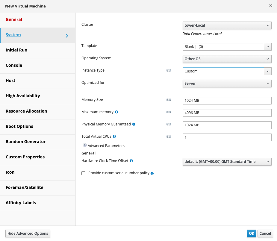 Advanced Optionsto expand the menu you don’t see a Systems item). Edit the Memory, Virtual CPU and Hardware Clock time. Note if the KVM host has been configured with hyper-threading enabled 2 virtual CPUs = 1 core.